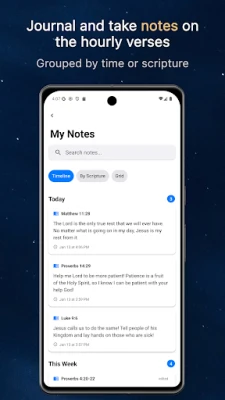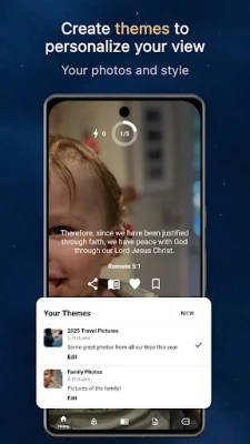 바이블아워는 당신만의 영적 여정을 위한 세심한 맞춤 설정을 제공합니다. 믿음, 치유, 평화, 사랑과 같은 특정 주제를 선택하거나, 성경 전체에서 무작위로 구절을 받아 광범위한 지혜를 경험할 수 있습니다. 가장 개인적인 방식으로, 소중한 사진들을 활용하여 앱의 테마를 직접 꾸밀 수도 있습니다. 마음에 깊이 와닿는 구절들은 즐겨찾기에 저장하고, 지혜, 용서, 격려 등 자신만의 기준에 따라 분류하여 특별한 말씀 컬렉션을 만들며 영적 자산을 축적해 보세요. 지나간 시간의 말씀들도 언제든 다시 찾아볼 수 있어 기억을 되새기는 데 유용합니다.