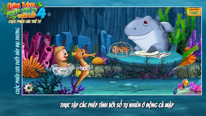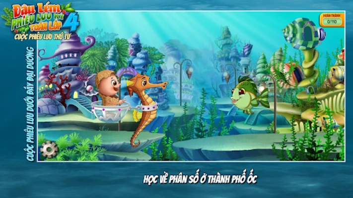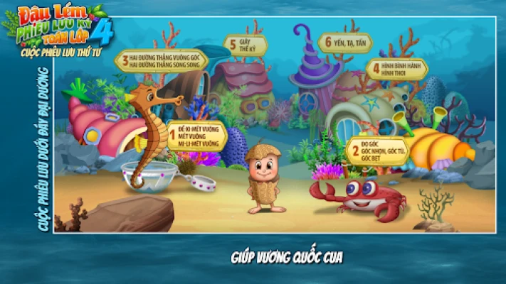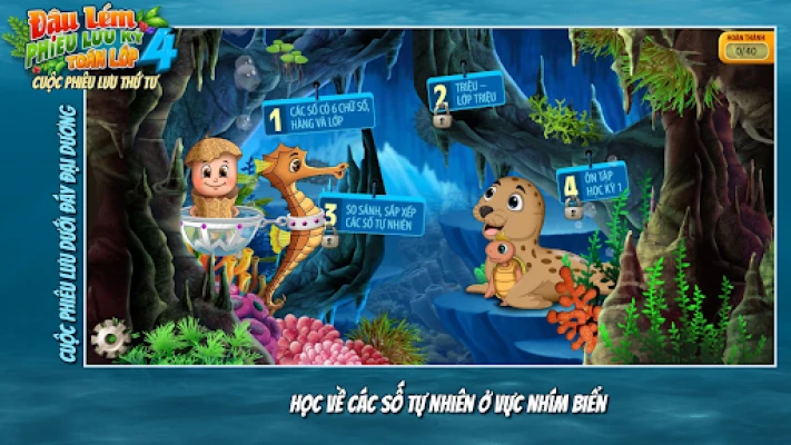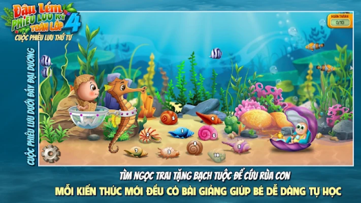 흥미진진한 모험은 깊고 푸른 바다에서 시작됩니다. 우주를 여행했던 Đậu Lém이 예기치 않게 대서양 깊은 곳에 착륙하면서 이야기가 전개됩니다. 이곳에서 Đậu Lém은 길 잃은 아기 거북이 여섯 마리를 찾아 헤매는 어미 거북이를 돕게 됩니다. 아름다운 해저 세계를 탐험하며 숨겨진 아기 거북이들을 찾는 여정은, 4학년 수학 교과 과정의 여섯 개 핵심 장과 완벽하게 연결됩니다. 아이들은 신비로운 바다 속 친구들과 교감하며 수학 문제를 해결하고, 미션을 완수하는 과정에서 자연스럽게 핵심 개념을 익히게 될 것입니다.