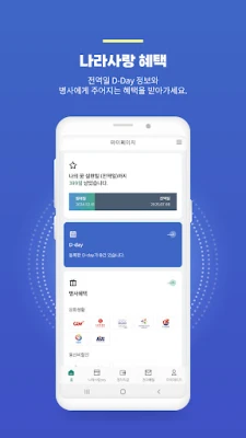 NFC 기능을 활용하여 나라사랑카드에 담긴 전자병역증 및 전자전역증을 손쉽게 확인하고, 병역판정검사 여비, 입영 여비, 복무 중 급여 계좌를 간편하게 조회하고 관리할 수 있습니다. KB국민은행과 IBK기업은행의 나라사랑카드가 제공하는 대중교통, 스타벅스, 편의점 할인 등 다채로운 혜택 정보도 한눈에 파악하세요. 나아가, e-메일 입영통지서 수신 확인부터 입영일 D-DAY 관리, 그리고 필수 준비물 정보까지, 입영을 앞둔 분들을 위한 체계적인 지원을 나라사랑포털APP이 제공합니다.