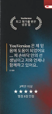전 세계 1억 8천만 명이 넘는 사람들이 사용하는 이 무료 성경 앱으로 말씀을 읽고, 듣고, 보고, 나누세요. 수백 가지 언어로 된 1천 개 이상의 번역본과 수많은 묵상 계획을 제공합니다. 나만의 성경 이미지, 하이라이트, 책갈피, 노트로 개인화된 성경 읽기를 경험하세요.