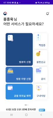 정부세종청사를 비롯한 13개 청사 방문객 및 근무자를 위한 필수 솔루션입니다. 방문증 간편 신청, 공용회의실 실시간 예약, 시설 불편사항 즉시 신고, 주변 편의시설 정보 검색까지, 복잡한 청사 업무를 손쉽게 처리하고 효율성을 높여줍니다.