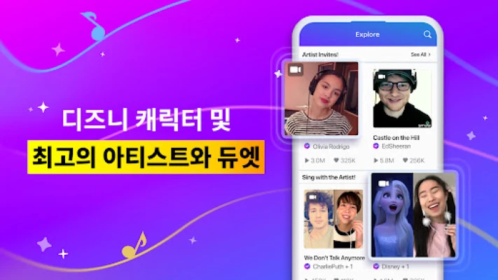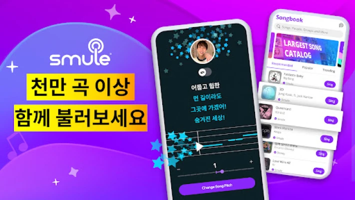 음악과 함께라면 세상이 무대가 됩니다. Smule은 당신의 목소리가 빛날 수 있도록 1천만 곡이 넘는 방대한 음악 라이브러리를 선사합니다. K-pop의 최신 히트곡부터 팝, 록, 발라드, OST의 불후의 명곡까지, 모든 장르를 아우르는 곡들을 고품질 반주와 실시간 스크롤 가사와 함께 즐겨보세요. 언제 어디서든 Smule과 함께라면 당신은 나만의 특별한 노래방 세션을 만들고, 숨겨진 재능을 발견하며 음악적 열정을 마음껏 펼칠 수 있습니다.